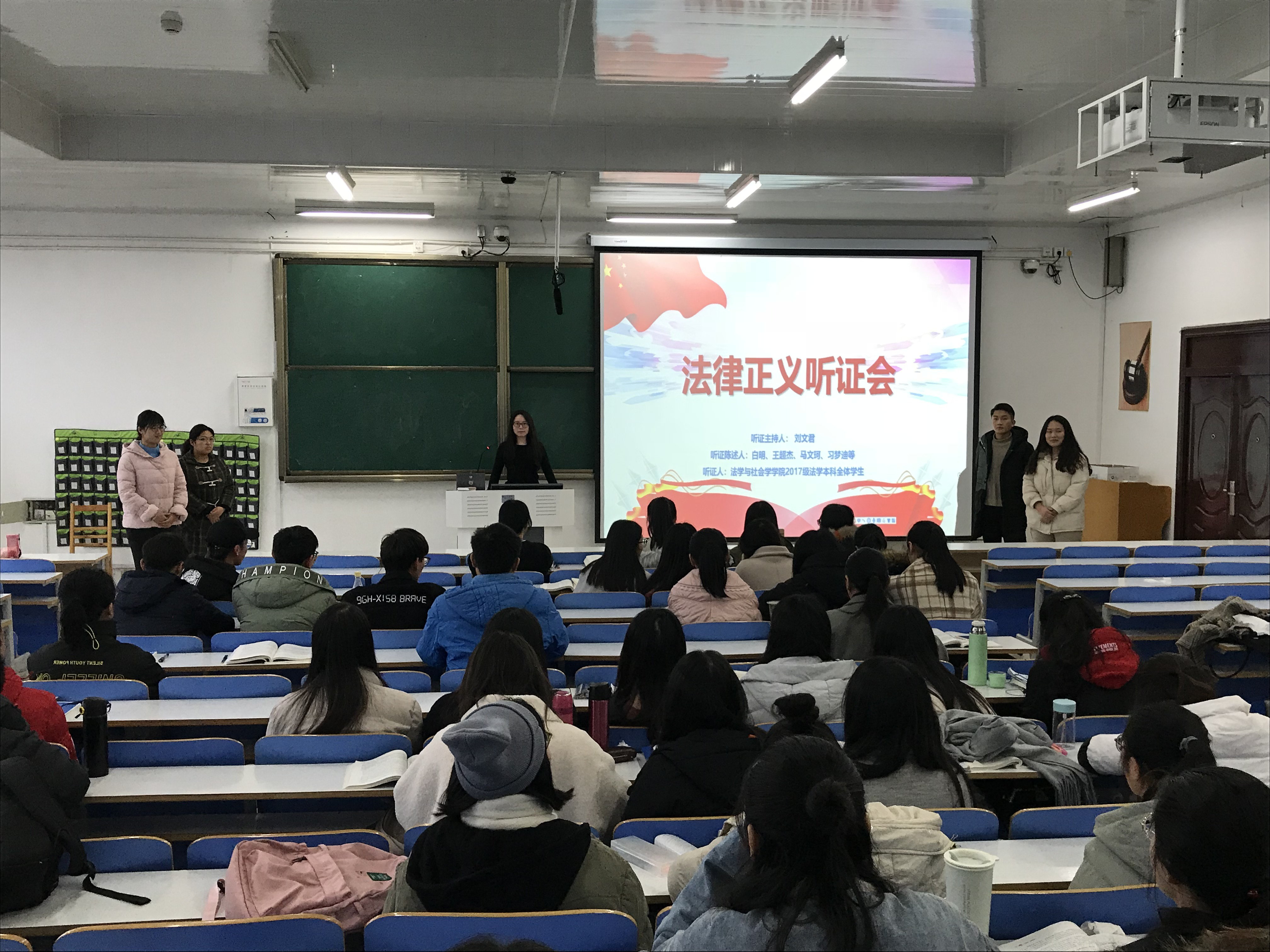 2018年12月5日,williamhill威廉希尔2017级法学班在社科楼517开展了一次别开生面的“法律正义听证会”。201法学系部分师生参与了此次“法律正义听证会”。此次法律正义听证会是法律职业道德课程的实验教学演练。其基本教学要求为,“教师事先确立相关组织规则;听证会参与人需具有广泛的代表性;教师作为首席新闻发言人可以安排其他发言人回答问题”。听证会的环节依次为,“主持人先宣布听证会开始,紧接着首席发言人阐释听证的目的和方式,然后进入问答环节,最后由首席发言人作最后总结”。通过听证会问答的方式,参会者总结了法律职业道德的理论要点,澄清了法律正义的实践误区。更具现实意义的是,参与式学习可以培养学生们深入思考的能力,锻炼其观点阐释和论证技能。