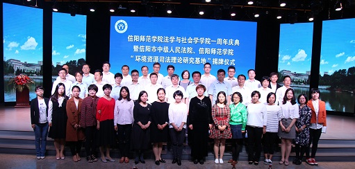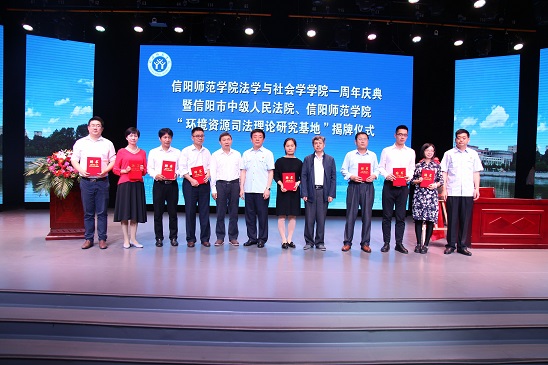9月27日,williamhill威廉希尔一周年庆典暨信阳市中级人民法院、信阳师范学院“环境资源司法理论研究基地”揭牌仪式在社科楼演播厅隆重举行。校长李俊、副校长王文臣,信阳市中级人民法院院长张新中、副院长陈焕成,法社学院全体教师、学生代表近200人参加了活动。活动由法社学院党委书记王文华主持。