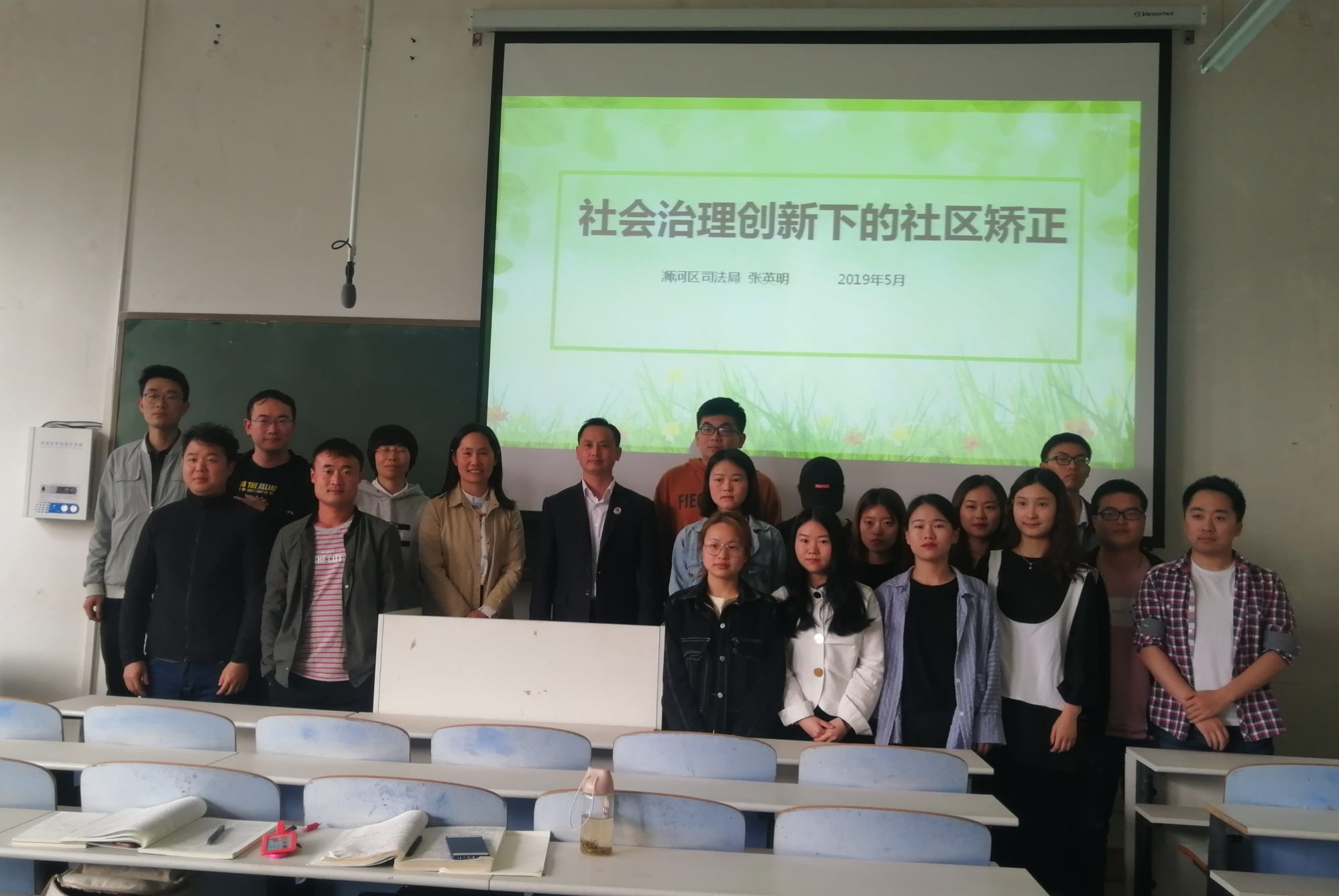 讲座伊始,张英明结合我院开设的《社会工作法学》课程,从司法局社区矫正工作展开,全面介绍了社区矫正的历史沿革以及我国的社区矫正现状;结合自己从信阳师范学院毕业到浉河区最偏远的基层司法所、再到现在的工作岗位的一路成长经历,详细介绍了浉河区社区矫正工作情况;结合相关案例谈了对于社会治理创新下的社区矫正的思考。