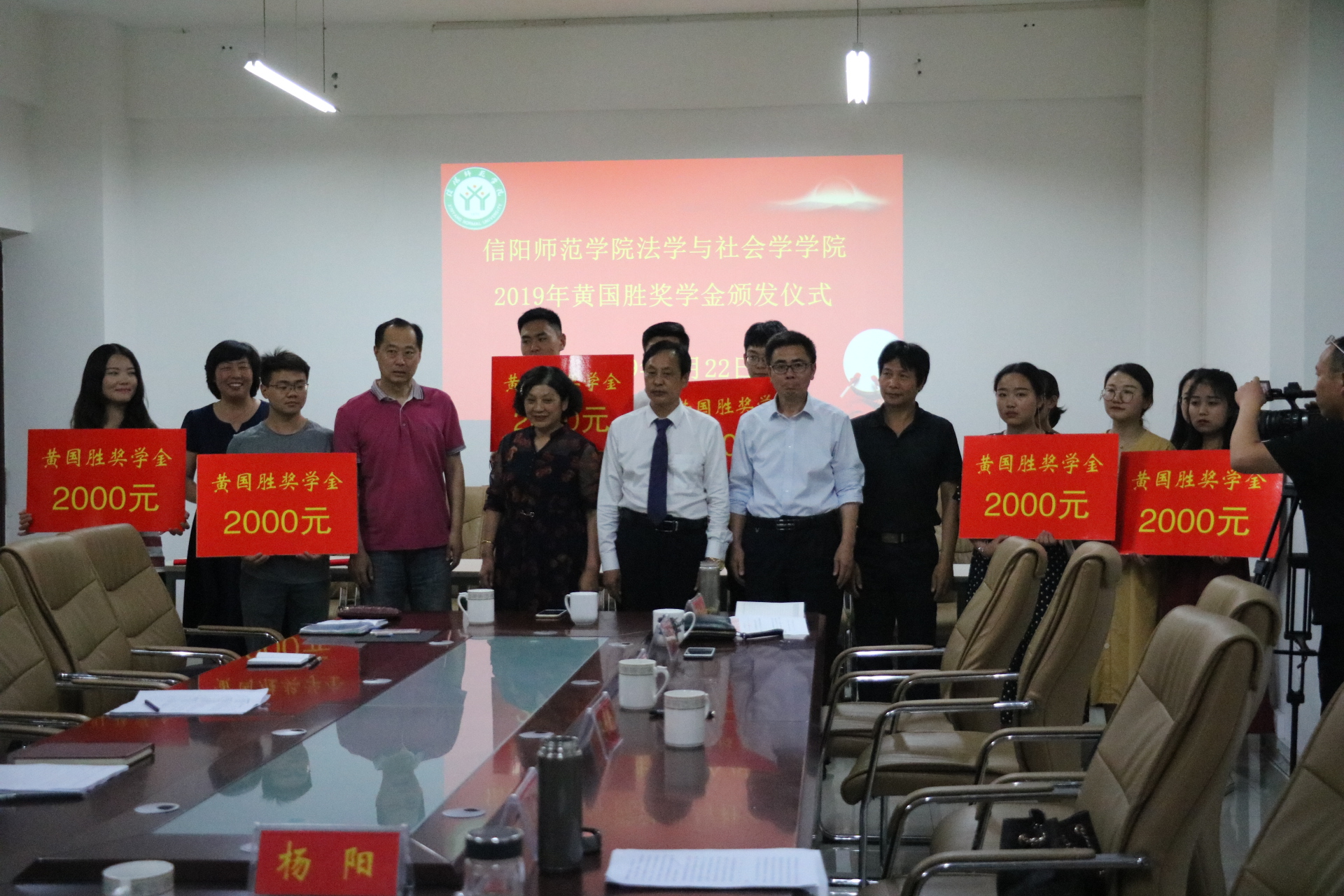 5月22日,“圆梦谭山”-2019年黄国胜奖学金颁发仪式在社科楼412会议室举行。信阳师范学院对外联络处处长耿劲松、河南省黄国胜律师事务所黄国胜主任及其夫人陶世勤女士、williamhill威廉希尔院长李文发、副院长贾义保、党委副书记樊德玲和全体获奖学生参加了仪式。参加仪式还有信阳电视台和信阳日报社的媒体朋友。仪式由樊德玲主持。