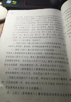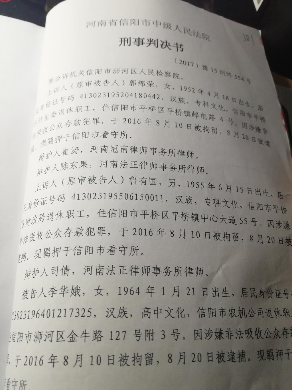 郭某、鲁某与李某于2013年始截至2016年1月8日共吸收资金28950000元,未兑付资金21668980元,并从集资中获利6126165元。后经河南省浉河区人民法院2017年8月29日一审判决郭某有期徒刑4年6个月,归还集资并处罚金人民币15万元。2017年8月31日郭某提起上诉,并由郭某的丈夫吴某委托辩护人出庭为其辩护。