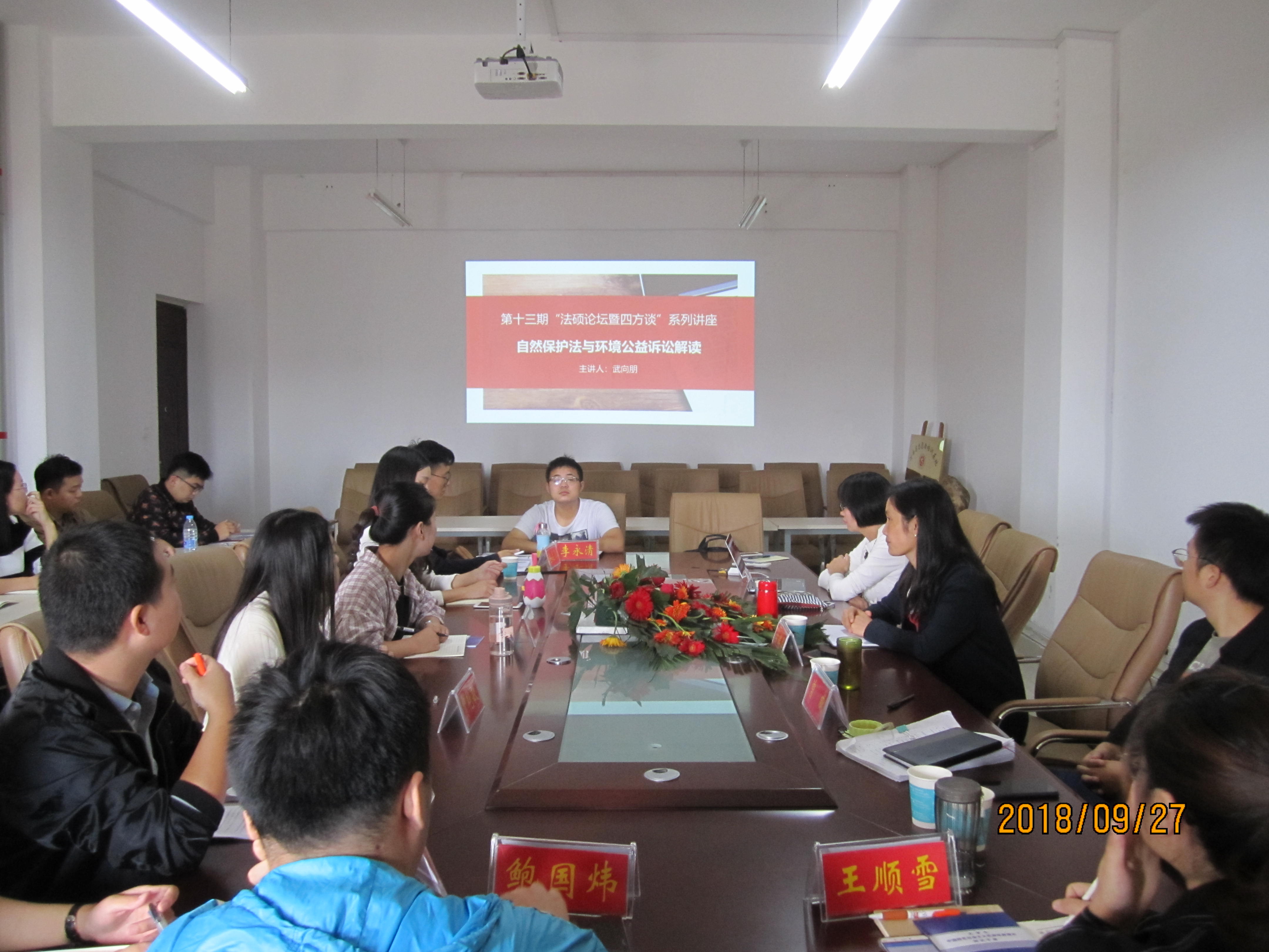 时间:2018-10-10 09:57 来源: 作者:admin 阅读: 次2018年9月27日上午,法社学院第十三期法硕论坛暨“四方谈”系列讲座在社科楼412会议室举行。本期讲座主题为“自然保护法与环境公益诉讼解读”,法社学院武向朋副教授担任此次讲座的主讲人,曾威博士担任点评人。讲座由学院党委委员古瑞华副教授主持,2017级、2018级法律硕士研究生聆听了本次讲座。