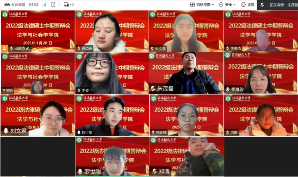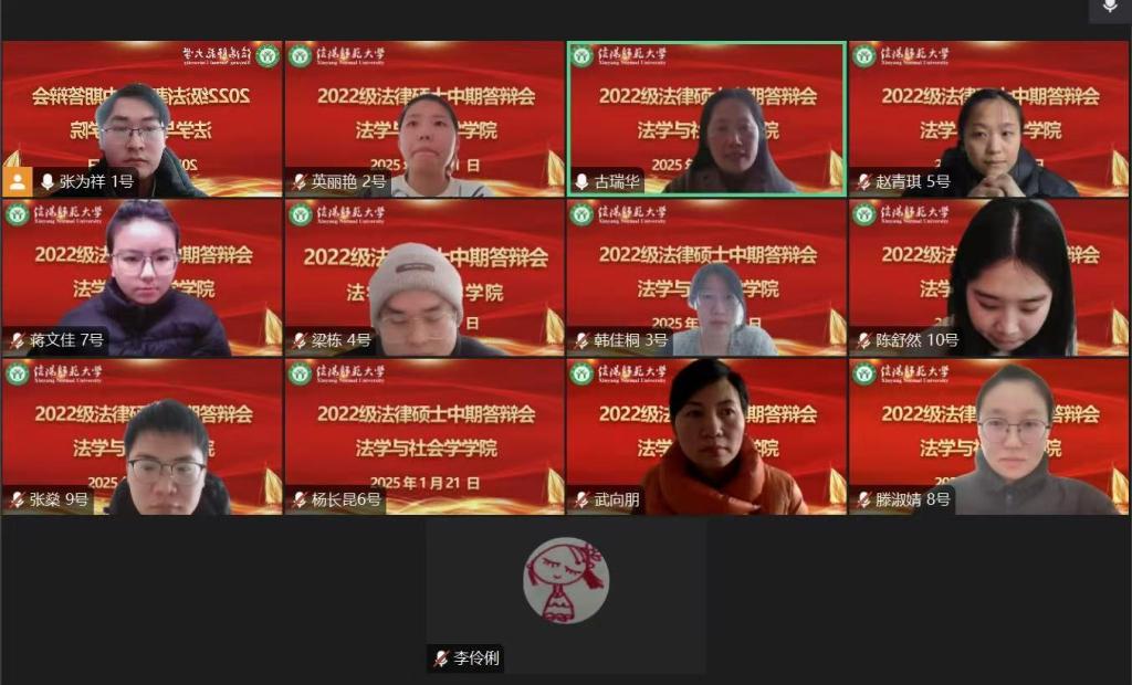 时间:2025-01-23 15:53 来源: 作者: 阅读: 次1月20-22日,我院于腾讯会议顺利举行2022级法律硕士线上中期答辩会。古瑞华、陈东果、朱茂磊分别担任答辩会员会主席,武向朋、李伶俐、张宇、彭晓娟、李昱晓、刘文君担任答辩委员会委员,我院2022级32位法律硕士参加了本次中期答辩。