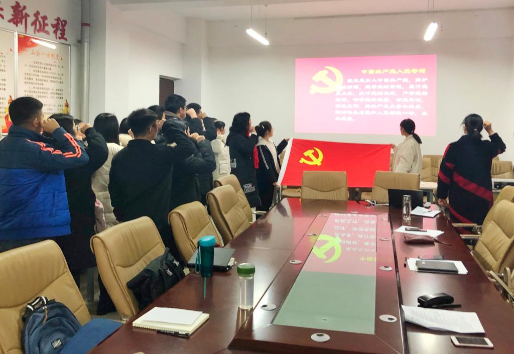 会议开始,申请人代表饶雪平宣读入党志愿书,表明其加入中国共产党的决心。介绍人王强、杨秀娟和赵亚丽同志分别介绍所联系发展对象的情况并做出评价意见。经有表决权的党员通过不计名投票,决定接收饶雪平等二十一位发展对象为中共预备党员。随后,樊德玲发表讲话,对党员提出要求。她指出,入党不仅代表着光荣,更代表着责任。学生党员要以优秀党员的标准严格要求自己,坚定不移地追随党的步伐,为党增光添彩。樊德玲强调到,作为一名党员,要从学习上、思想上入党,切实发挥党员的先锋模范作用。最后,预备党员在武向朋的带领下面向党旗进行庄严宣誓,并由樊德玲和袁艳红授予其党徽。本次被接收为预备党员的同志感到十分自豪,他们表示将以优秀党员为榜样,努力提高自我,向党组织靠拢。