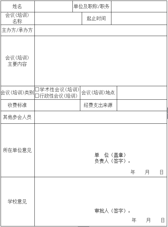 (三)教职工外出,须同时向学院党委书记和院长请假,并向学院分管领导报备,同时填写《williamhill威廉希尔教师外出请假审批报备表》(附件1)《信阳师范学院工作人员出差审批单》(附件2)《信阳师范学院教职工外出参加会议(培训)审批表》(附件3),办理手续后报党政办公室。如遇事急需临时外出的,应通过电话、微信等请假,返校后及时补办请假手续。