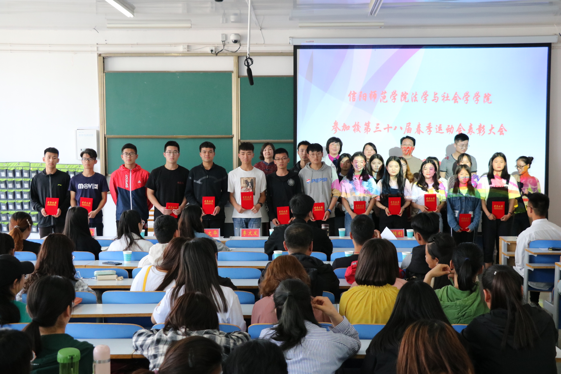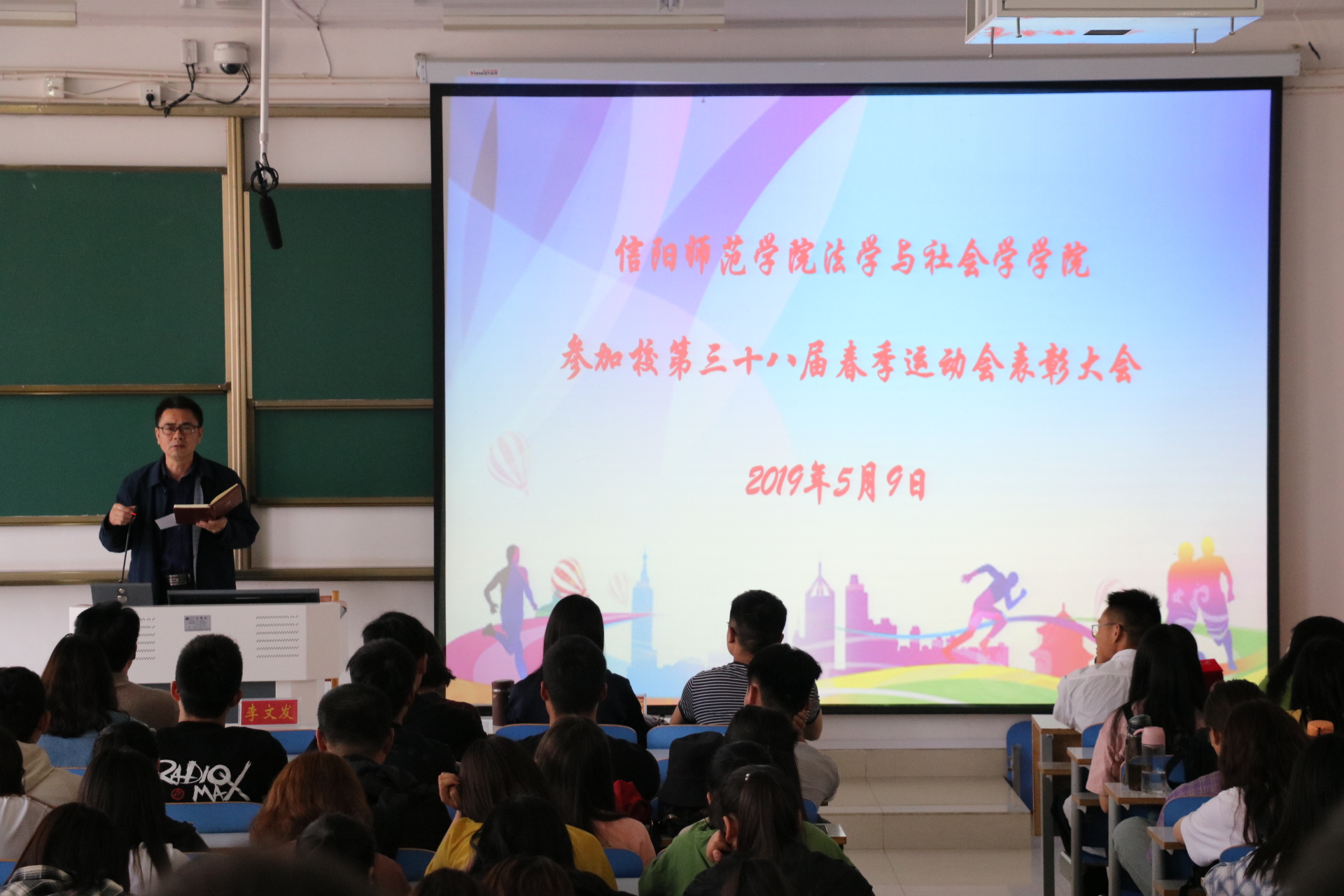 时间:2019-05-10 08:35 来源: 作者:admin 阅读: 次阳光拥抱青春梦想,拼搏铸就法社辉煌。5月9日,法社学院第三十八届春季运动会表彰大会在社科楼413教室举办。学院院长李文发、党委书记王文华、党委副书记樊德玲、副院长胡亚云等领导老师,与教练员、运动员、后勤保障人员共200多人参加了表彰大会。会议由樊德玲主持。