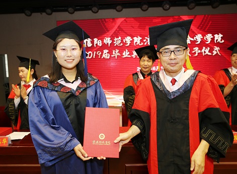 典礼在新时代大学生合唱团演唱的歌曲《放心去飞》中拉开帷幕。伴随着歌声,背景屏幕播放了学院为毕业生精心制作的MV——《我的大学》,MV再现了同学们大学时光共同成长的画面,其中温馨和熟悉的画面让很多毕业生不禁泪流满面,内心充满了对同学、师长、母校的感恩之情。随后,全体起立,唱国歌。礼毕后,贾义保宣读了《关于授予姜登禹等15名同学 “2019届优秀毕业生”荣誉称号的决定》,张义明宣读了《关于授予姬佳欣等61名同学“学习标兵”荣誉称号的决定》,胡亚云宣读了《信阳师范学院williamhill威廉希尔2019届毕业生获得学位学生名单》。随即,在热烈的掌声中,全体2019届毕业生依次列队上台,学院领导老师们庄重地为每位毕业生拨苏正冠,颁发学位证书并合影留念。