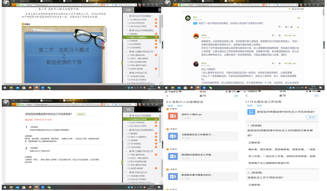 时间:2020-03-22 11:55 来源: 作者: 阅读: 次为贯彻落实学院新冠肺炎疫情期间“停课不停学”的要求,社会工作系祁中山、蔡瑾等老师充分利用网络教学平台与网上教学资源,精心设计课程的内容,采用速课、讨论互动、测验、课下作业等多种教学形式,开展专业课教学,保障了教学的效果和质量。