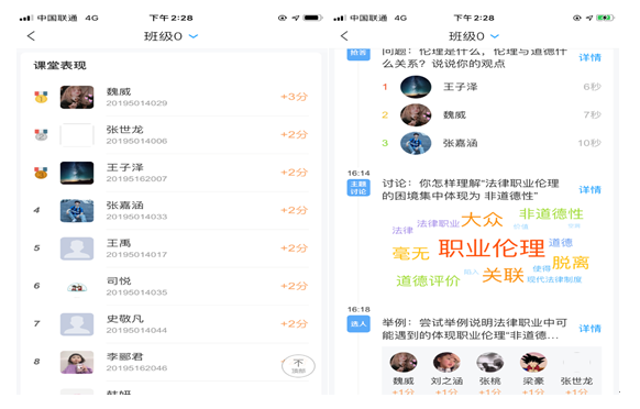 基于网络教学所固有的局部网络不稳定的情况,刘老师采取了多种教学平台互动教学的方式授课。一方面,纵向挖掘。通过深度开发网络平台抢答、摇号选人、头像签到、名师讲座等趣味互动模式,消解网上教学非接触互动的弱点,有效的提高了同学们的学习和讨论热情;另一方面,横向拓展。通过综合运用各类网络平台,开展了班级直播、速课、MOOC教学;小组微信/QQ讨论教学等形式,有效的保证了不同情况下的教学效果。做到密切沟通,畅学无阻。