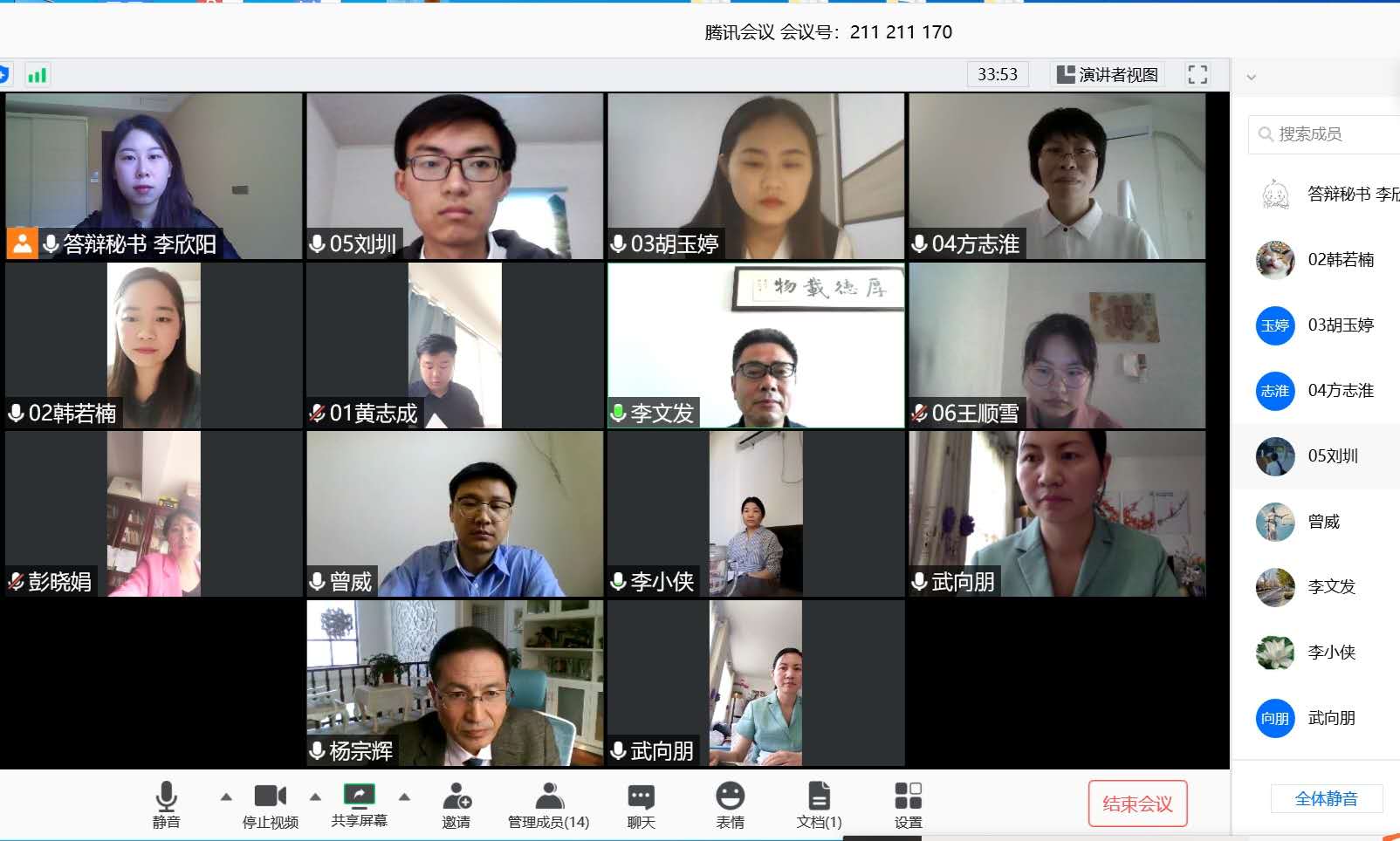 当天,根据学校疫情防控总要求和研究生处《关于做好2020届研究生毕业及学位授予工作的通知》的安排部署,6名未返校的法律硕士研究生参加了线上论文答辩会。中南政法大学教授杨宗辉担任答辩委员会主席,李小侠副教授、武向朋副教授、彭晓娟副教授、曾威博士担任答辩委员会委员。黄志成、方志淮、胡玉婷、韩若楠、刘圳、王顺雪6名同学均顺利通过学位论文答辩。