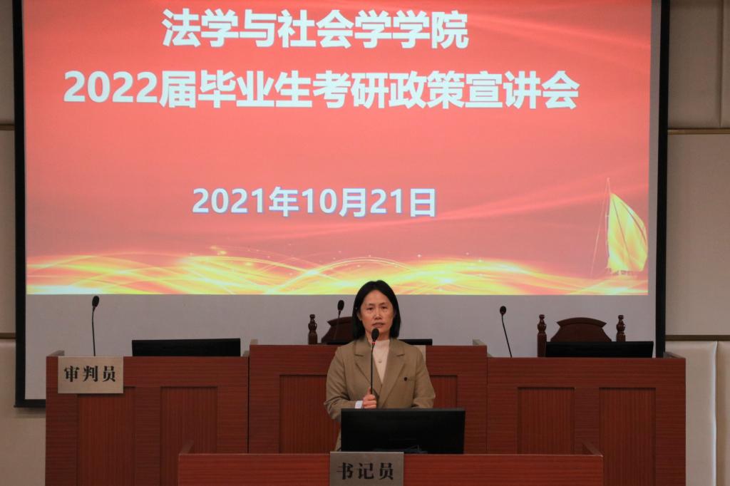 时间:2021-10-22 14:56 来源: 作者: 阅读: 次为科学精准指导和服务学生考研,10月21日,我院在模拟法庭举行了2022届毕业生考研政策宣讲会。学院副院长古瑞华、武向朋、团委书记袁艳红出席活动,2022届毕业生参加活动。宣讲会由武向朋主持。