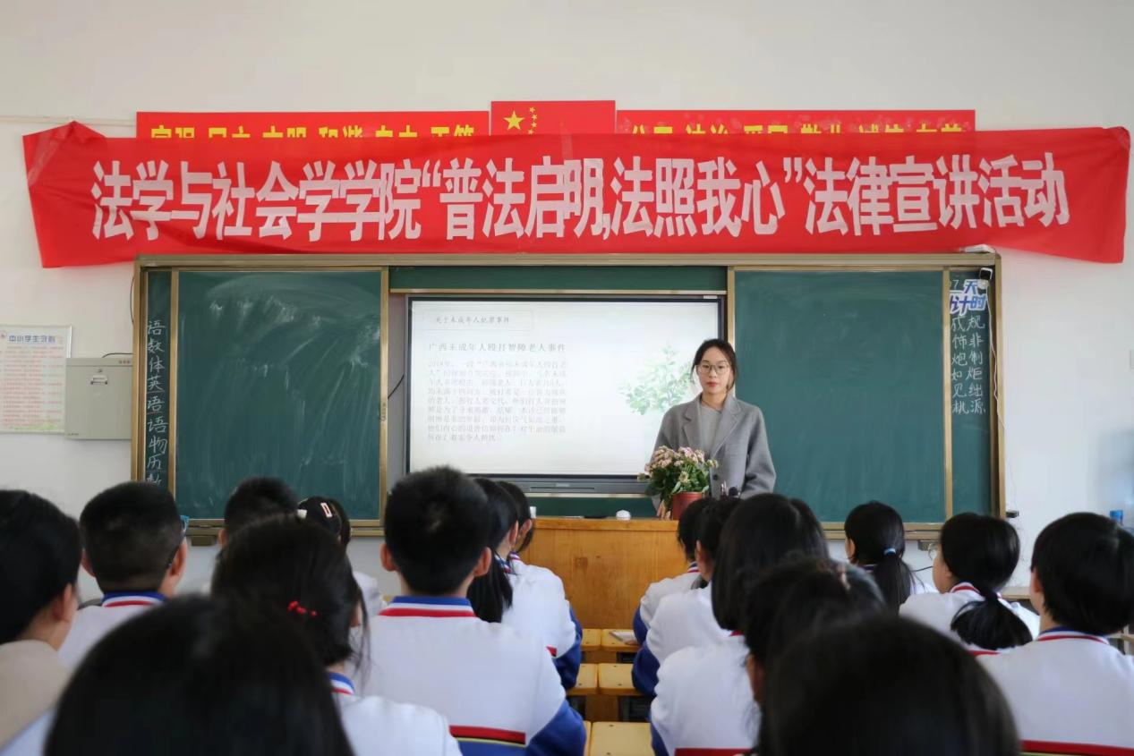 3月10日,2022级法学班在浉河中学开展“普法启明 法照我心”宣讲活动。志愿者通过互动问答、情景再现等形式向初中生讲解、演示与日常生活密切相关的法律常识,引导同学们学法、懂法、用法。