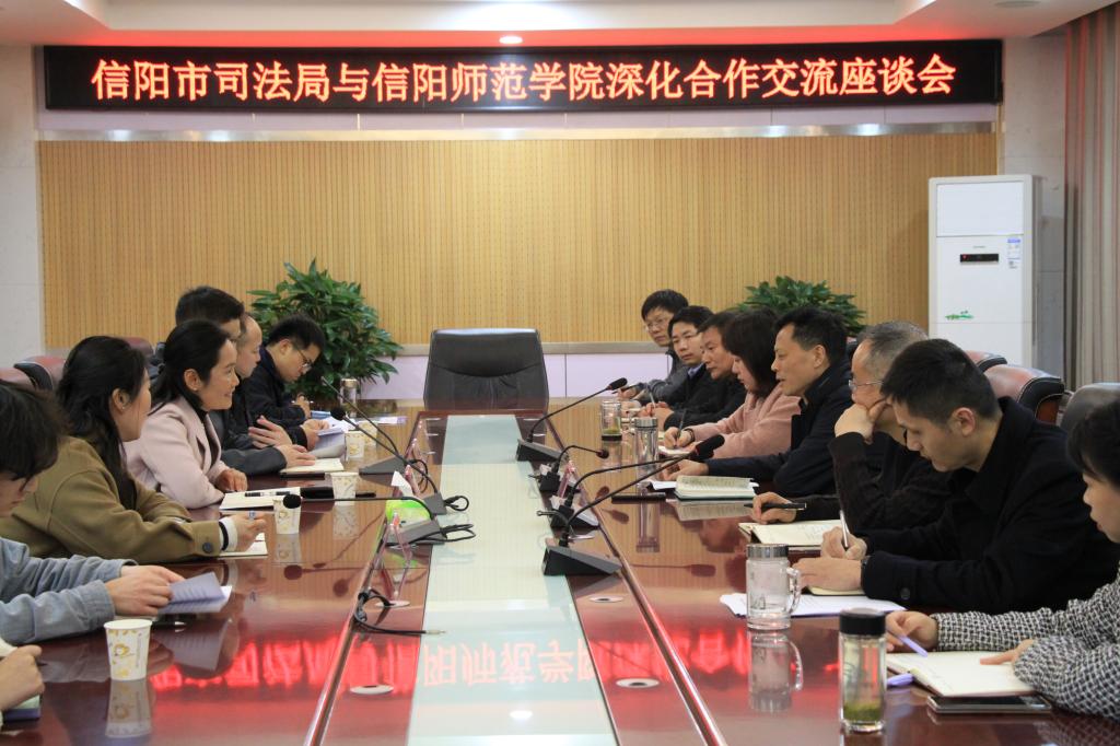 时间:2023-04-06 16:38 来源: 作者: 阅读: 次4月4日下午,信阳师范学院williamhill威廉希尔与信阳市司法局深化合作交流座谈会在信阳市司法局举行。学院副院长(主持工作)古瑞华、党委委员张宇,信阳市司法局四级调研员刘晓、市法律援助中心主任王强等出席座谈会。我院师生代表及司法局各科室负责人参加会议。