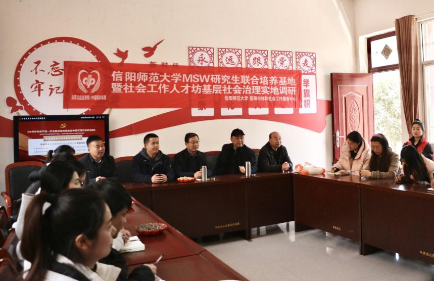 下午,调研团队与何畈村村支书、信阳市祥和社会工作服务中心负责人、社工站工作人员及信阳市心理卫生协会“心援在线”、信阳卓越公益事业发展中心等单位的专家学者共同召开座谈会。与会人员围绕调研成果、乡村社会服务体系建设、资源整合及社工人才培养等议题展开讨论。张玉鹏指出,这次调研是William威廉MSW教育中心联合社工机构与社会公益组织开展的一次有意义的活动,有助于进一步提升师生社会实践能力,学院将继续依托专业优势,推动社会工作人才培养与基层社会治理深度融合,为乡村社会服务体系建设和乡村振兴战略实施贡献智慧与力量。