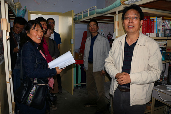 在宿舍登记处履行登记手续后,老师们在宿管阿姨的引领下进入学生宿舍进行检查。在检查学生宿舍过程中,王文华书记细心询问宿管阿姨学生们的住宿情况和宿舍卫生、内务整理等方面的问题。以王书记为代表的老师团队对各寝室的安全隐患进行了排查,尤其是电线、插口、用电器等充满着安全隐患的角落。王书记注意到,学生宿舍喜欢用遮光床帘,出于对学生安全的考虑,他建议同学们不要使用遮光床帘,以免学生在床上发生意外而无人知晓。宿舍检查完毕后,王书记表示了对学生宿舍卫生状况的满意,并对宿舍工作人员的爱岗精神表达感谢之情。