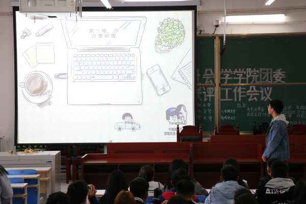 会议共分为三大部分,学生会部门、社团,和班级的工作总结,均采用成员演讲、介绍PPT内容的形式展示。内容涵盖了这半学期以来所做的工作,清楚的展示了我院学生会成员的辛勤努力;介绍各位成员,加强了学生会成员的互相了解;展望未来,增强干事们对未来工作的积极性及信心。最后,学生会主席李清超对本次会议作出总结,他对学生会的工作予以肯定,也提出了不足。他希望学生干部要懂得全面锻炼,放开视野,不能只局限于自己的工作,要学习他人,扬长避短,共同推进学生工作的更好开展。