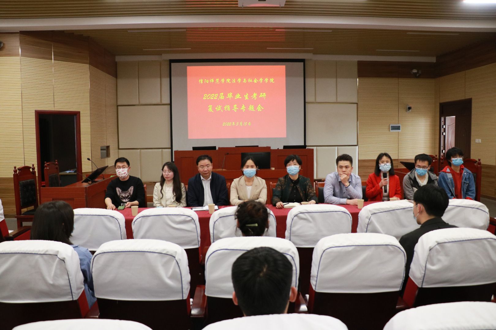 为有效帮助我院2022届考研学生备战研究生复试与调剂工作,鼓励考研学子以更高热情、最佳状态投入考研复试,3月15日下午5点,法学与社会学学院于社科楼413组织开展2022届毕业生考研复试指导专题会,党委副书记李莉、副院长古瑞华、朱茂磊博士、刘文君博士、祁中山博士、张宇博士、陈东果副教授莅临指导,团委书记王艳丽主持,法社学院2022届毕业生参加,同时邀请研究生学长学姐分享经验。