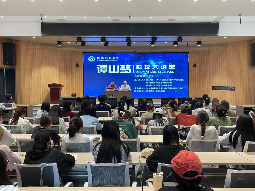 6月13日,“谭山梦”校友大讲堂第28讲在谭山书院大学生活动中心举行,我校2000级贸易经济专业校友、河南善济律师事务所主任、信阳市人民政府法律顾问张少亮受邀做了题为《与青春签约》的主题报告。法学与社会学学院师生代表聆听了报告,报告会由对外联络办公室负责人主持。