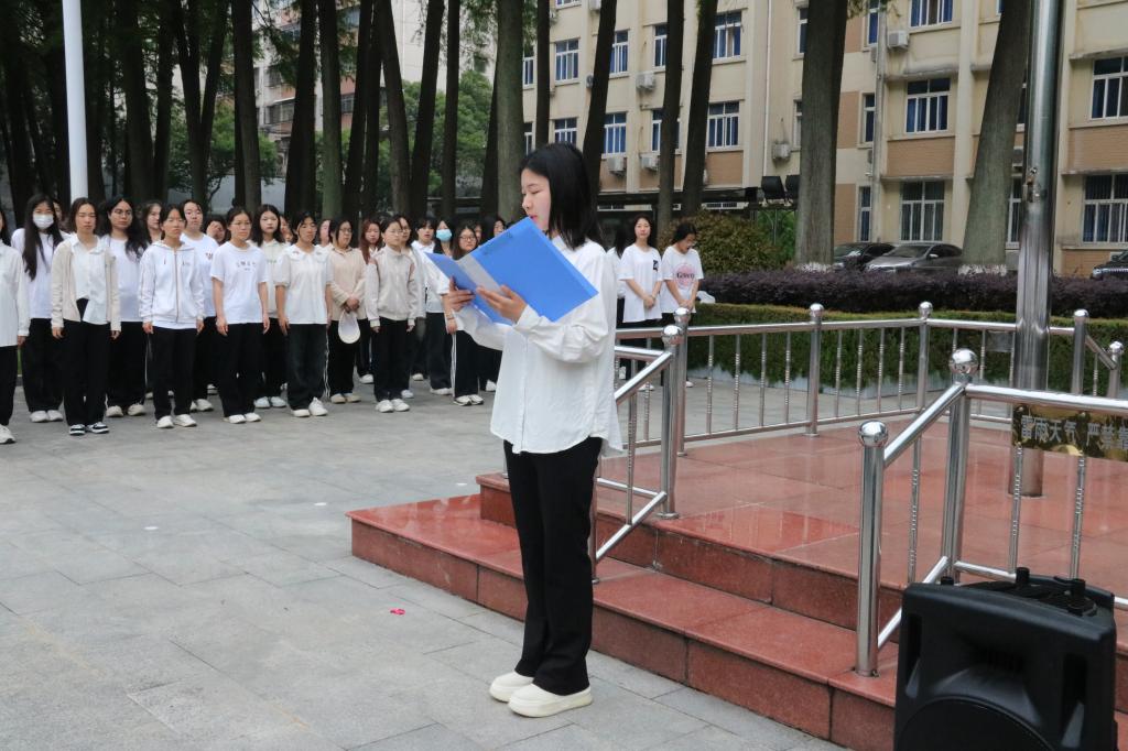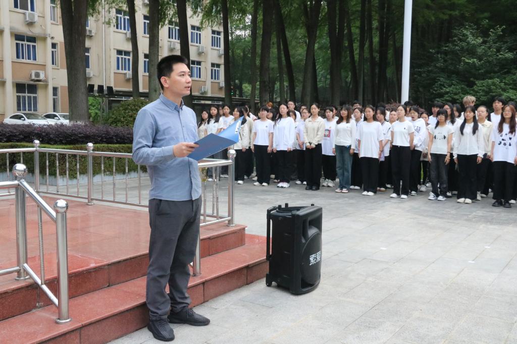 升旗仪式开始,国旗护卫队迈着铿锵有力的步伐护送鲜艳的五星红旗正步走向旗杆,伴随着庄严的国歌声,鲜艳的五星红旗冉冉升起。参加仪式的全体师生肃立,向国旗行注目礼。礼毕后,费泽丹发表国旗下讲话,他表示,我们是祖国未来的建设者,肩负时代的使命,我们要珍视眼前的机遇和挑战,努力学习,不断进步,为祖国繁荣昌盛、民族复兴贡献自己的力量。随后,曾令存带领全体同学重温入团誓词,铭记党的初心和使命。康琪苗和刘雨田围绕“担当民族复兴大任的时代青年”这一主题分别在国旗下演讲。最后,由周宇堃带领全体同学在国旗下朗诵《少年中国说》,自豪感与荣誉感在每个人心中激荡。