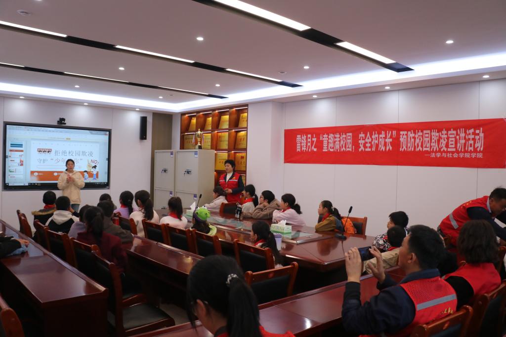 活动伊始,学院志愿者结合《未成年人保护法》《预防未成年人犯罪法》等法律法规,精心设计了“法治微课堂”,通过案例分析,为小学生们系统阐释校园欺凌的界定标准、行为特征及法律后果。特别设置的情景剧场环节,通过播放普法短视频,沉浸式展现校园欺凌的应对策略,引导青少年掌握“拒绝沉默、及时求助、固定证据”三步维权法。在互动问答环节,同学们踊跃参与案例讨论,通过角色扮演深化对法律知识的理解,切实增强了法治教育的实效性和感染力。