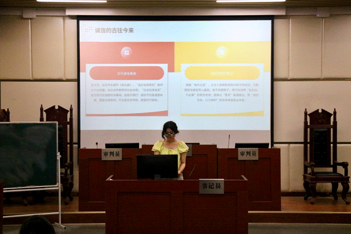 比赛过程中,参赛选手紧扣主题,多角度阐释诚信内涵。李钰洁、魏婧媛等选手以“曾子杀猪”“徙木立信”等典故为切入点,梳理了诚信思想的历史渊源与发展脉络,彰显诚信文化的深厚底蕴;翟梦源、张雨晨等选手立足法学专业特色,聚焦《中华人民共和国民法典》诚信原则,论述了诚信建设对社会信用体系和法治化营商环境的重要意义。选手们的精彩表现,充分展现当代青年对诚信价值的深刻思考。