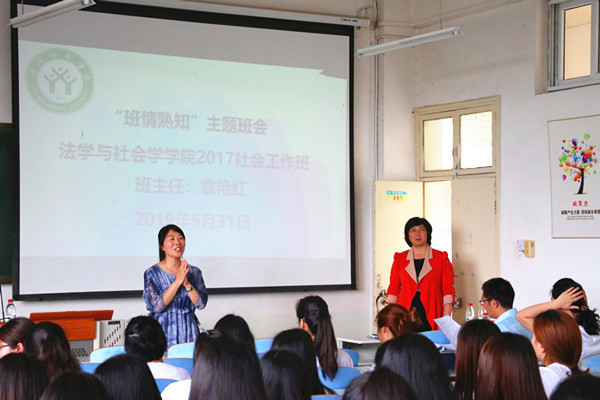 首先,由学生处副处长陈铭说明班会流程与要求后,袁老师随即对班级情况进行介绍她讲到,2017级社工班是一个优秀的班集体、是一个具有爆发力的小宇宙,每到关键时刻大家都能积极参与、团结一心,总能带给许多感动。在接下来对班级同学情况进行随机抽查时,袁老师对抽查到的每一位同学的情况都了如指掌,可以看出她对每位同学的关爱与关怀。被抽取的每位同学都说袁老师在17社工班这个家庭中像一个妈妈一样,会认真地去关注同学们生活中的每件小事,离家在外的同学们表示这是他们所能体会到的最好的温暖。班会现场充满了温情与感动。最后,学生处副处长陈铭做总结发言,他对2017级社会工作班做出了高度评价,也对袁老师的班级工作表达了高度的肯定,并对法社学院的发展和班级建设表达美好祝愿。