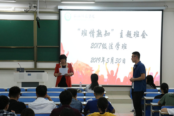 班情熟知的主题班会上,樊书记向班级同学发放个人信息调查表,填写完毕后从中随机抽取几名同学,并请辅导员万潍江介绍抽取同学的个人情况。万老师用幽默风趣的语气介绍了同学们的家庭状况班级表现、教师评价等信息,使得班级气氛十分活跃。在随后的考研交流会中,万老师为同学们播放刘净文离校视频和17级法学班全体同学为刘净文同学录制的祝福视频,以此表达对班代的美好祝福与希冀。刘净文表示十分感谢同学们的祝福,接着,刘净文同学同大家分享了自己考的一些经验,提醒大家要合理选择学校,并且在有了明确的目标后要为之努力付出。最后,刘净文同学祝愿17级法学班全体学生能够在两年后考到自己理想的学校本次班会至此圆满结束。
