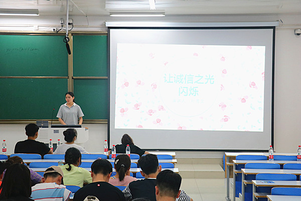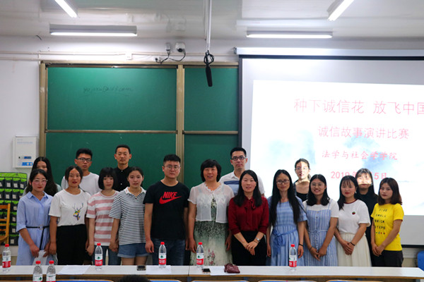 为深入贯彻落实社会主义核心价值观,实现中华民族伟大复兴的中国梦,6月5日晚上,法学与社会学院于社科楼517举办“种下诚信花,放飞中国梦”主题演讲活动。党委副书记樊德玲,团委书记袁艳红,专职辅导员王艳丽,团委老师杨胜利,2017级法学班辅导员万潍江受邀出席活动,2018级百余位同学观看比赛,聆听演讲。
