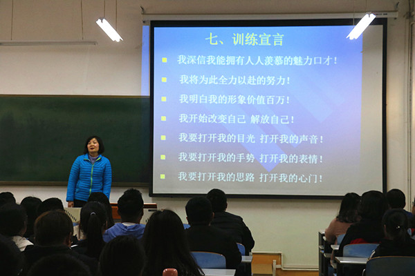 讲座伊始,胡亚云老师向大家讲述了与人沟通的重要性并邀请大家放声朗诵《魅力口才训练宣言》。随后,她从发音与表达技巧两个方面向大家分析如何使自己的语言有层次、有感情,并帮助大家开发属于自己独有的语言魅力。本次讲座中,胡老师教大家如何用呼吸及共鸣训练控制发音,使声音洪亮有力,用停顿,抑扬和节奏将声音中的情感表达出来。在讲解表达技巧时胡老师重点介绍了情感在语言中的重要性,并带领大家使用语言技巧朗读了《荷塘月色》和《祖国啊,我亲爱的祖国》。最后,她带领同学们进行放松训练,同学们深觉参与此次活动受益匪浅。