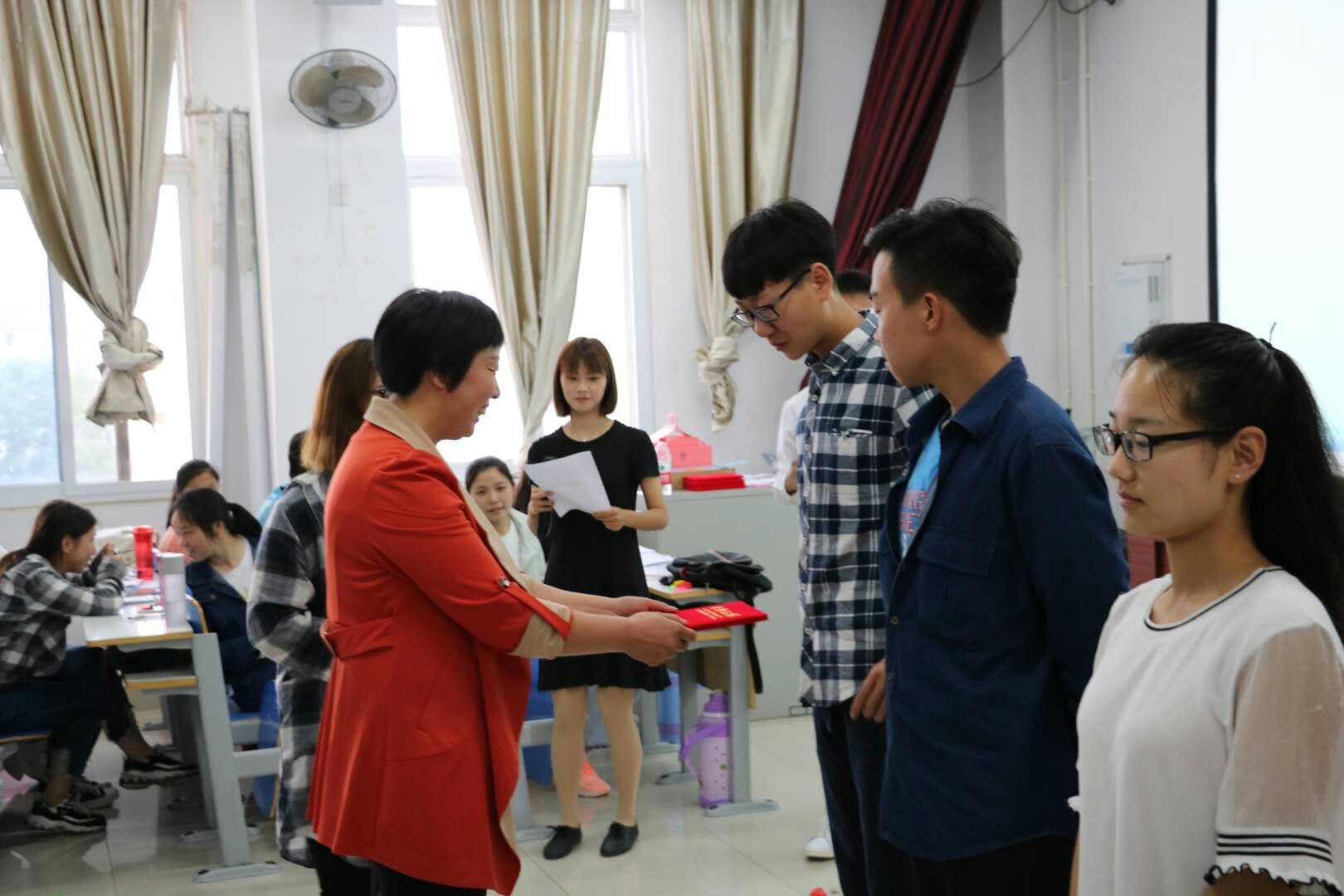 最后,主持人宣布比赛成绩,第一组高莉想、饶雪平等获得一等奖,第二组朱笛、张莹等获得二等奖,第三组、第四组魏聪聪、吕胜楠、杨雅莉、张艳慧等获得三等奖,樊德玲副书记为获奖选手颁发证书、奖品,并与各位老师以及幕后工作者合影留念。