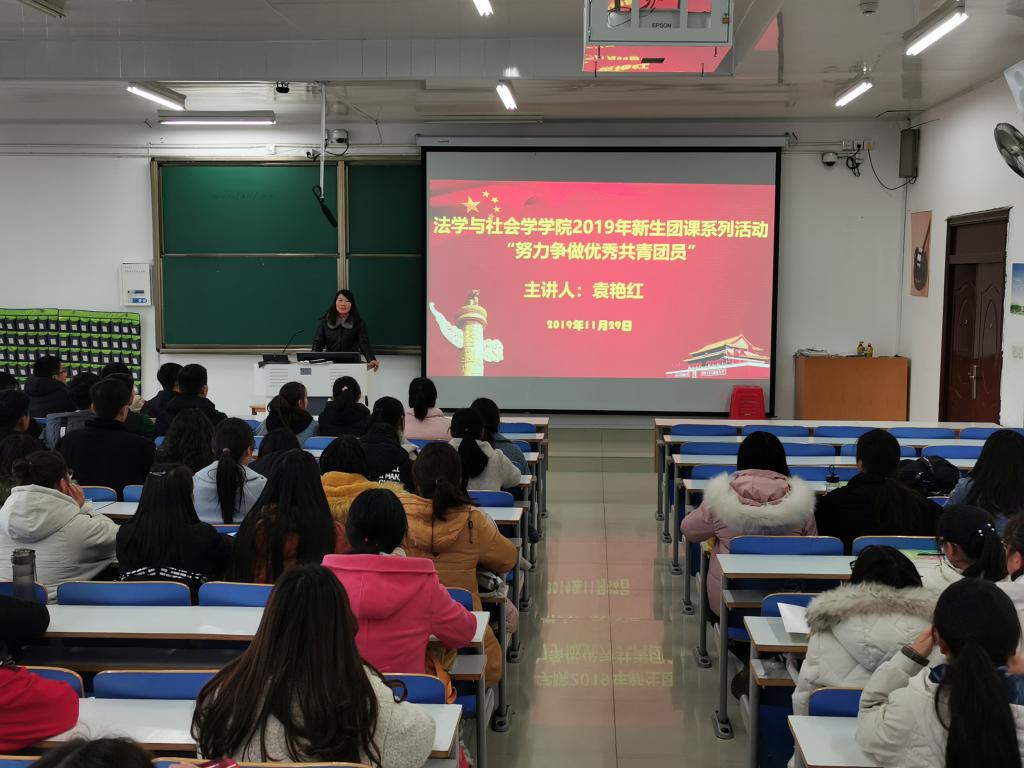 11月29日下午,williamhill威廉希尔于社会科学楼517教室举办williamhill威廉希尔2019年新生团课系列活动——“努力争做优秀共青团员”团课。本次团课由williamhill威廉希尔团委书记袁艳红主讲,williamhill威廉希尔2019级全体新生参加团课。