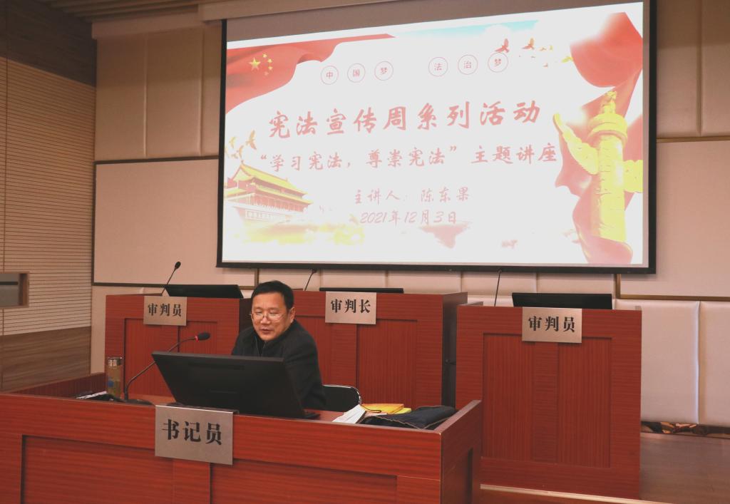 并通过列举多个真实案例从不同角度阐释了新时代依法治国、依宪执政的意义,在座的同学们认真聆听,受益颇深。陈东果强调,作为新时代新青年要深入了解宪法、尊崇宪法,自觉弘扬宪法精神,增强法治观念,成为学法、知法、守法,全面发展的合格大学生。此次讲座在同学们的阵阵掌声中圆满结束。