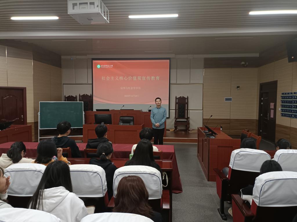 为深入贯彻落实党的二十大精神,激发青年学生的爱国情怀和社会责任感,树立正确的世界观、人生观、价值观,williamhill威廉希尔于11月20日在社科楼413举办“社会主义核心价值观宣传教育”主题班会,辅导员费泽丹讲授,2023级全体学生参加本次活动。