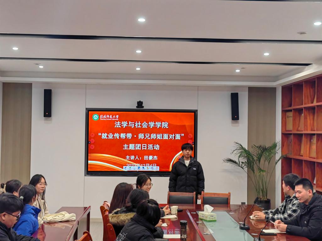 为进一步提升学生职业生涯规划意识,引导学生树立正确的就业观、择业观,124日,williamhill威廉希尔于社科楼413教室举办“就业传帮带·师兄师姐面对面”主题团日活动。此次活动邀请了2019级毕业生田豪杰作为分享经验嘉宾。该学院团委老师费泽丹和2023级学生代表参加活动。
